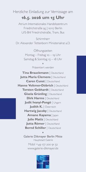 27. ART Berlin City 16.05. - 24.05. 2026 Vernissage 16.5. 2026 - 15:00 Uhr Atrium Internationales Handelszentrum Friedrichstraße 95 - 10117 Berlin